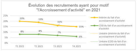 Du côté des embauches ayant pour motif l’accroissement d’activité en intérim ou en CDD, la situation est en légère baisse sur l’ensemble de l’année 2021. On observe une perte de terrain plus rapide et conséquente des contrats en intérim. La baisse est plus forte sur le second semestre de l’année. Les entreprises ont en effet privilégié le remplacement des postes en CDI et ont été plus attentistes côté intérim.
