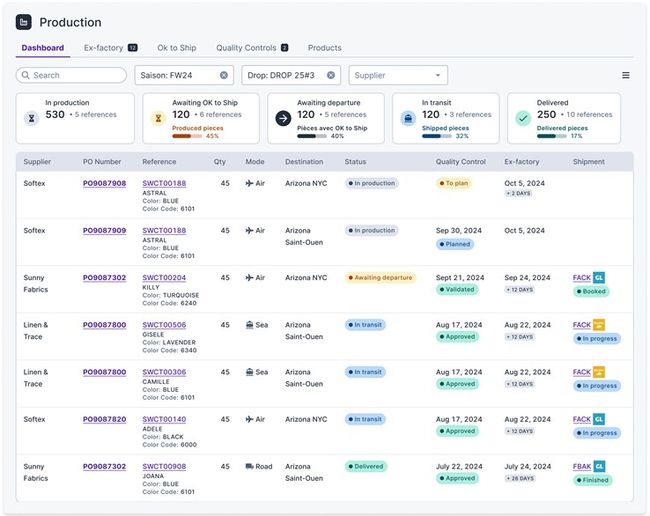 Suivi des PO en production et en transit. Crédit photo : OneChain Suivi des PO en production et en transit. |