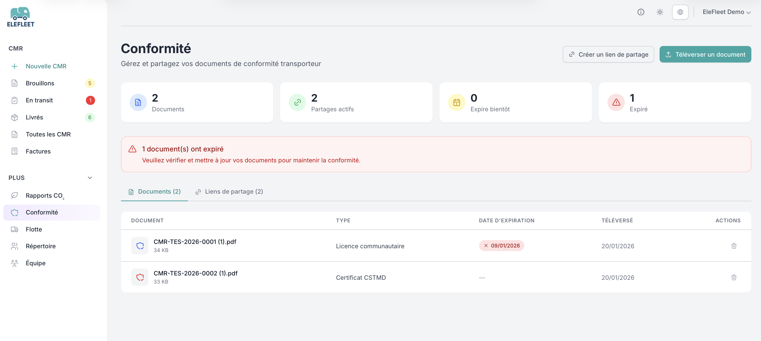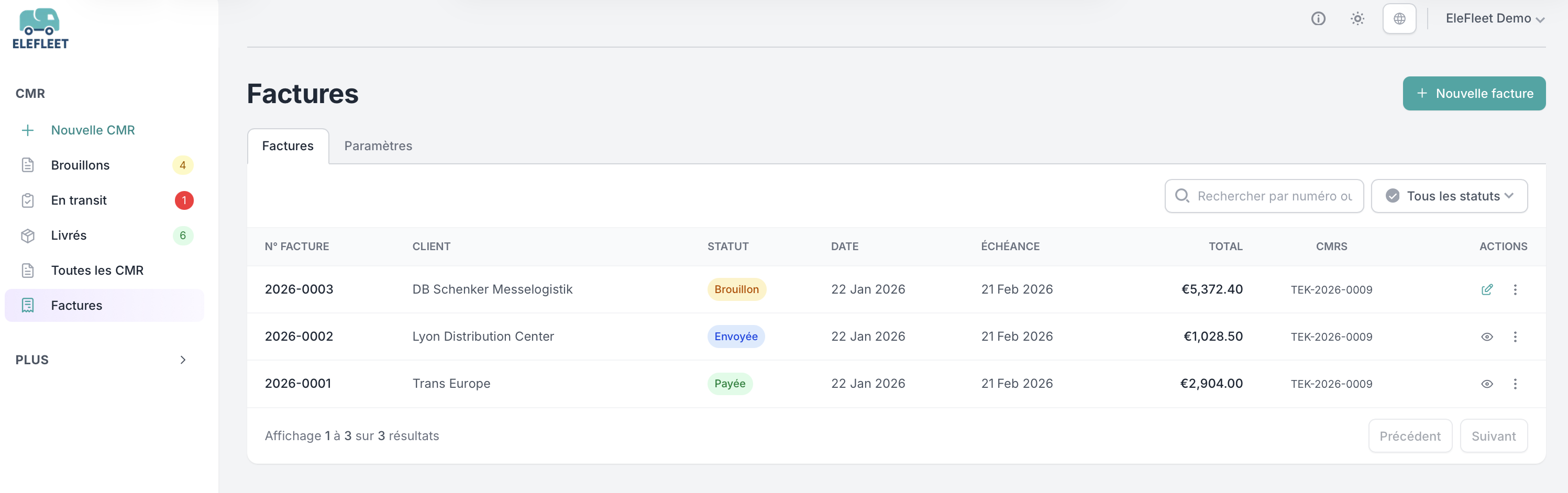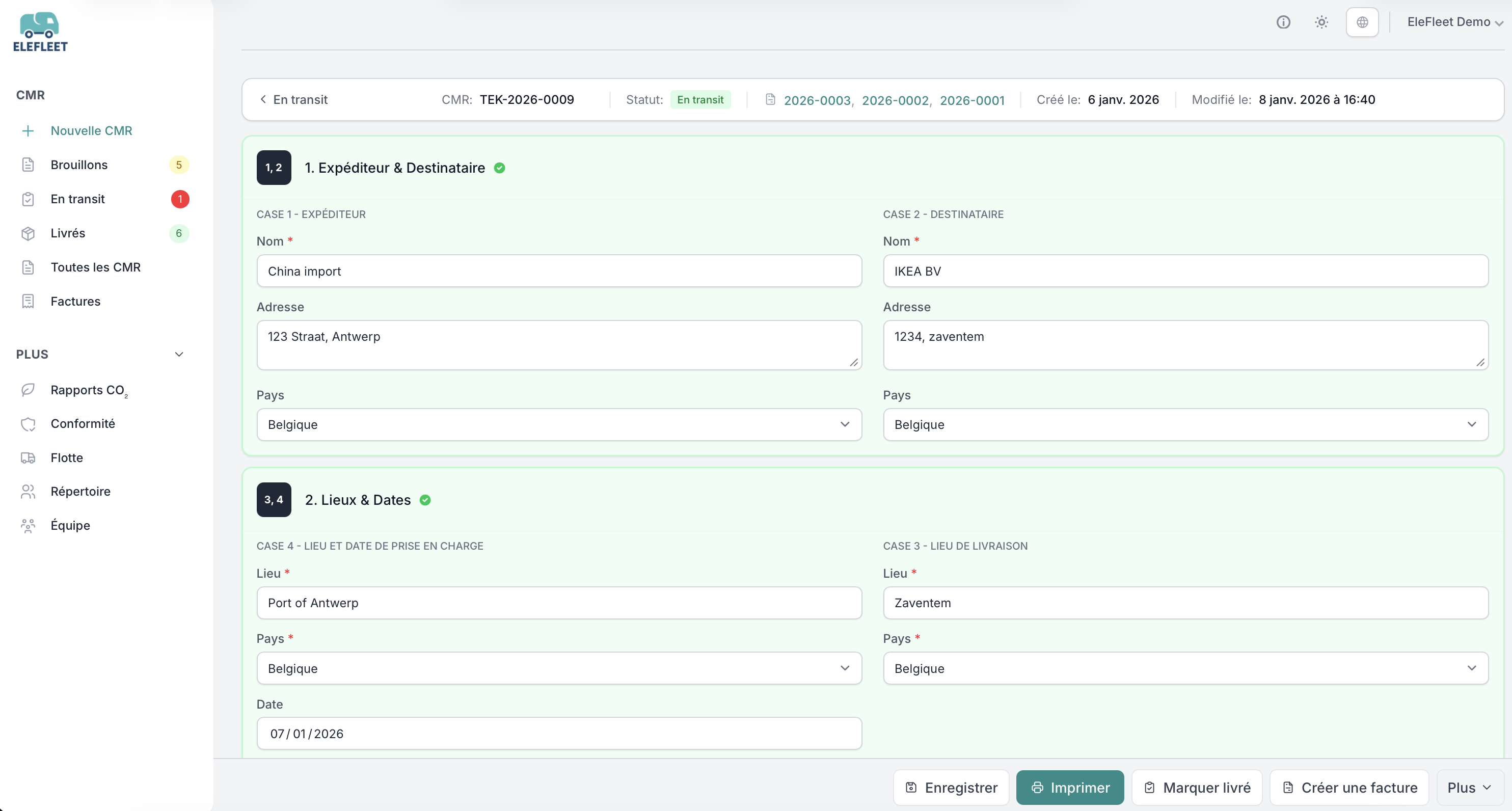 > E-CMR / Facturation / Preuve livraison / Reporting CO2 > EleFleet