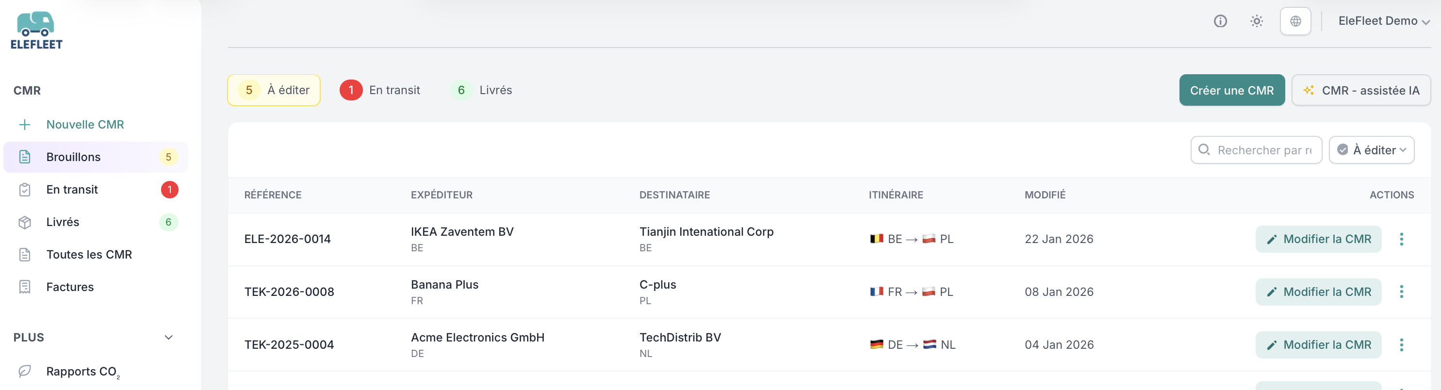 EleFleet est spécialisé dans la gestion des documents d’exécution du transport routier (CMR, preuve de livraison, CO₂, facturation) EleFleet est spécialisé dans la gestion des documents d’exécution du transport routier (CMR, preuve de livraison, CO₂, facturation) |