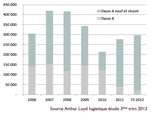 Du fait de la crise de 2008, les nouvelles constructions ont été plus faibles voire inexistantes, hormis pour des opérations « clefs en mains », c’est-à-dire des constructions réalisées sur-mesure pour un client identifié. La situation devient critique car, si le stock avait gonflé entre 2009 et 2010, il s’est réduit de façon importante au cours des 18 derniers mois. Nous pouvons l’estimer aujourd’hui à moins de 300 000 m².